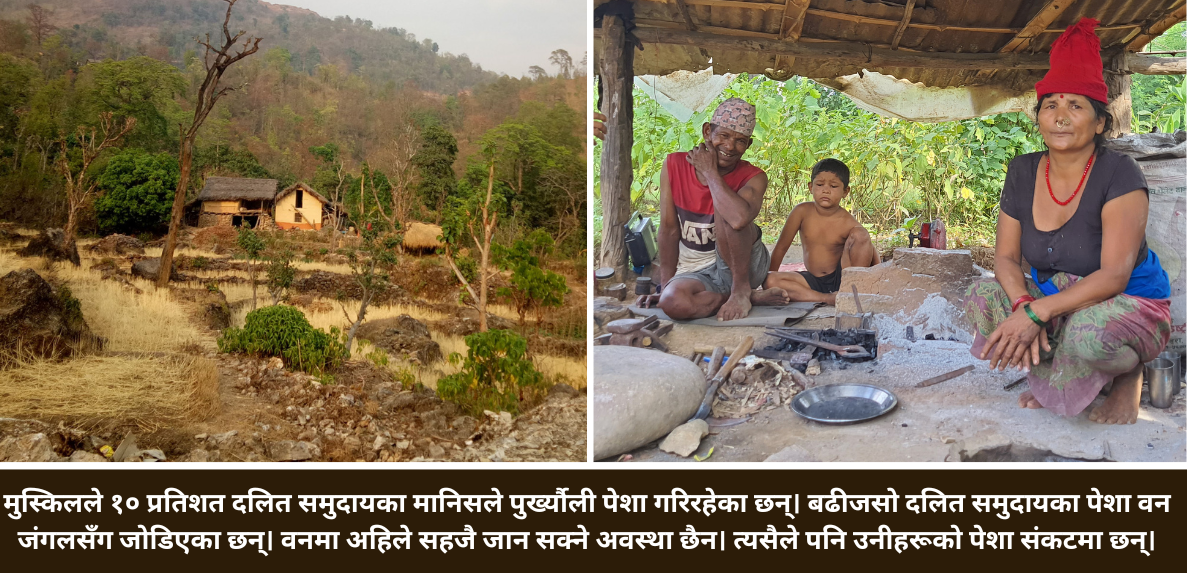 ‘एक वर्ष अगाडि हामीले कर्णालीमा दलित समुदायको पुर्ख्यौली पेशाको विषयमा अध्ययन गरेका थियौं। मुस्किलले १० प्रतिशत मात्रै मान्छेले जसोतसो गरेर पेशा गरेको पायौं,’ उनी थप्छन्, ‘बढीजसो दलित समुदायका पेशासँग जोडिएको विषय भनेको वनजंगल नै हो। त्यहाँ अहिले सहजै जान सक्ने अवस्था छैन। त्यसैले पनि यस्ता पेशाहरू संकटमा छन्।’